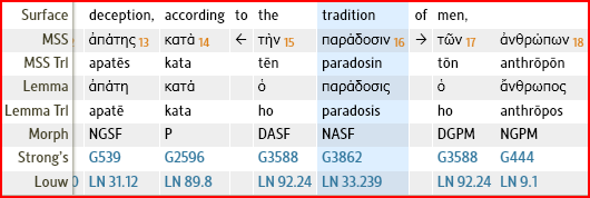 Next we get to the topic of “according to the traditions of menâ€. A lot of people will try to convince you that this is a reference to the Oral Law / traditions of the Pharisees and that Paul is trying to get people out from under the law. A good look at the Greek text of this phrase reveals some very interesting facts: