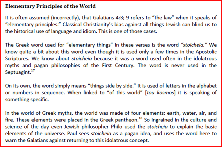 Thus we see that Paul is warning the people not to walk back into the religions and traditions of the community in which they stay. We also have the same pressures to fit into our own communities. Do what everybody else does so that you do not stand out or your children are not mocked at school. I see the religion of evolution as a modern day version of this. This religion has creeped into every part of our society and nobody even cares anymore. Our children learn it at school, watch DVDs that start with “millions and millions of years ago†and accept the “ape to man†as a proven fact. How much different would this be to the teaching of “the elementary things†of Paul’s day?