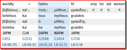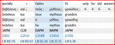 τοὺς δὲ βεβήλους καὶ γÏαώδεις μÏθους παÏαιτοῦ ‘keep away from godless myths such as old women are likely to tell’ or ‘keep away from godless and useless legends’ 1 Tm 4:7.